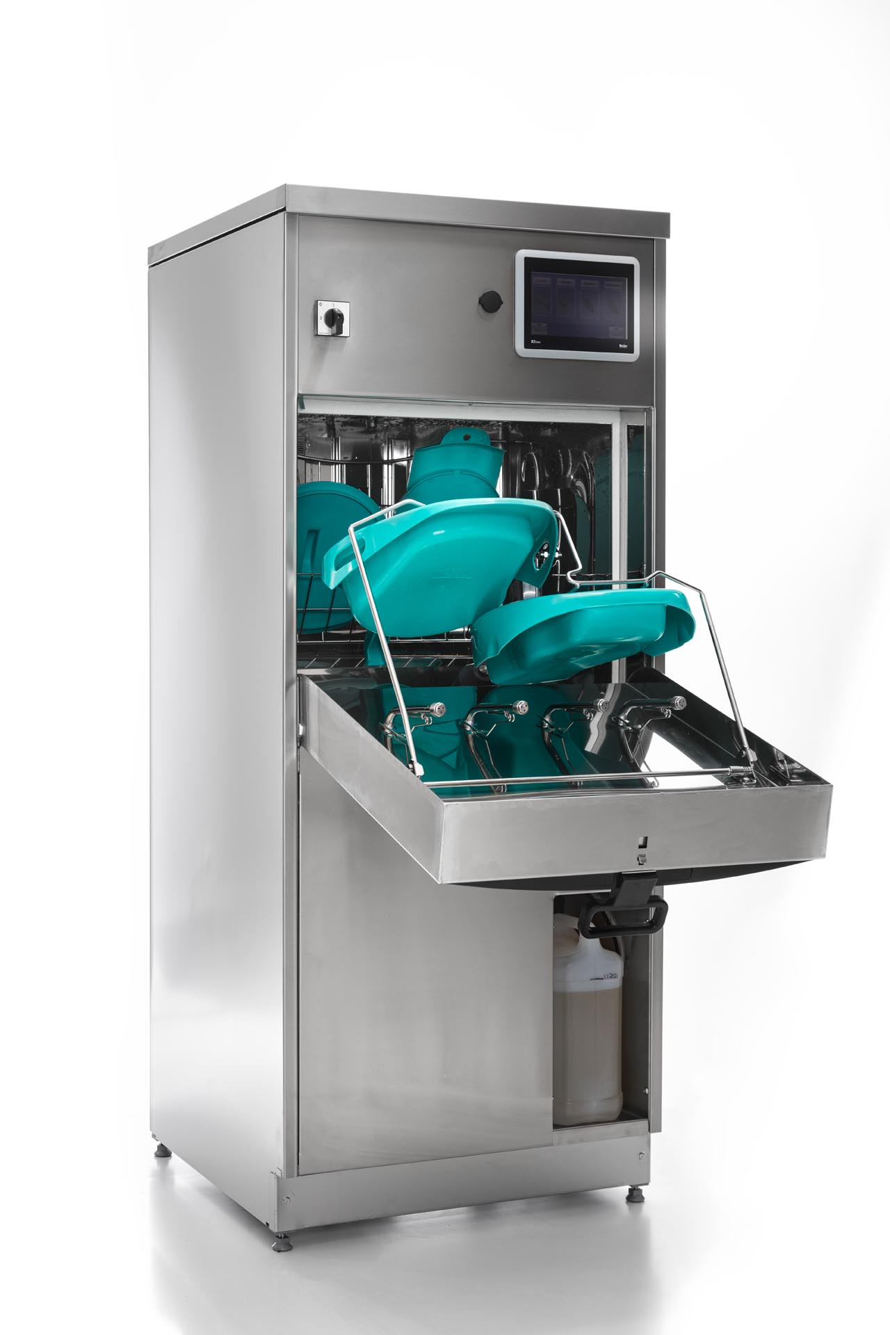 The Deko 190 iX has a large wash chamber and capacity for automatic emptying and processing of 2 bedpans with lids and 4 urine bottles simultaneously.