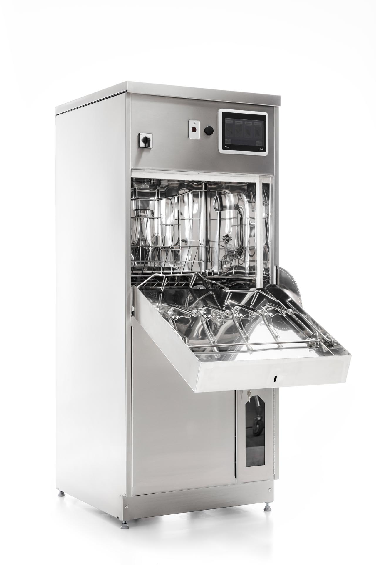 The Deko 190 has an integrated drop down shelf which provides space for 4 hand wash basins or a mop bucket with seating ring. The shelf can also be utilised as a base to accommodate and process inserts and washing accessories e.g. kidney dishes, bowls, vases, toilet brushes / holders, as well as, various hollow ware.