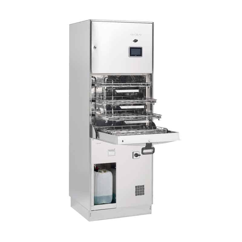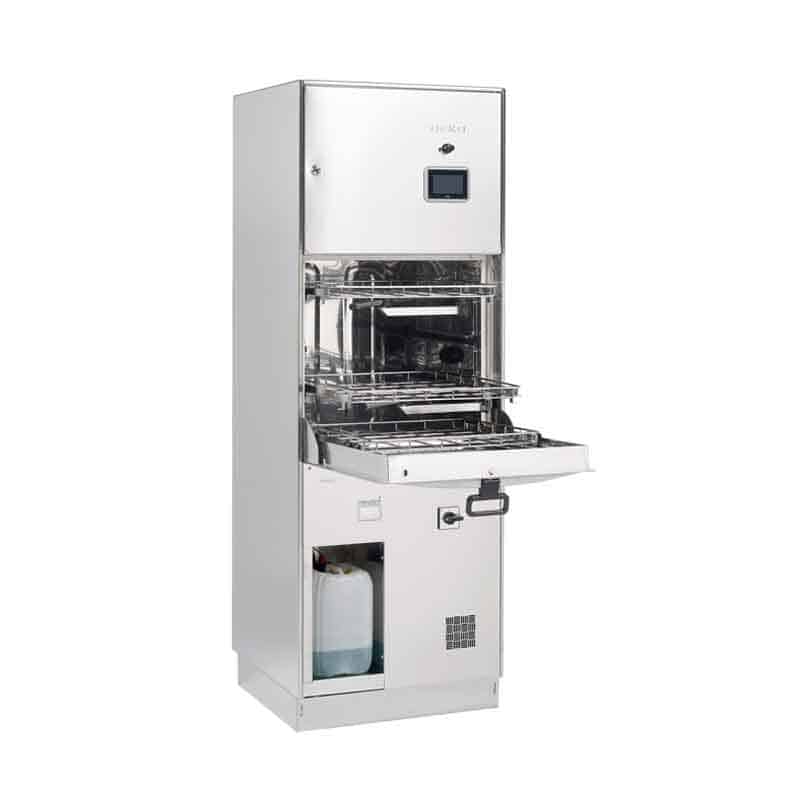 The Deko 260 is ideal for use in laboratories, hospitals, mortuaries, prisons and clinics. The design of Deko 260 means that it can be tailored to meet the individual user’s requirements. It is available in single door or pass through with up to 4 sliding, removable shelves. Despite its small footprint the Deko 260 has a large capacity and can accommodate 16 DIN (240 x 255 x 50 mm) trays over the 4 levels or, alternatively, the full 485 by the use of up to 5, easily checked, rotating wash arms coupled with a range of specific racks.