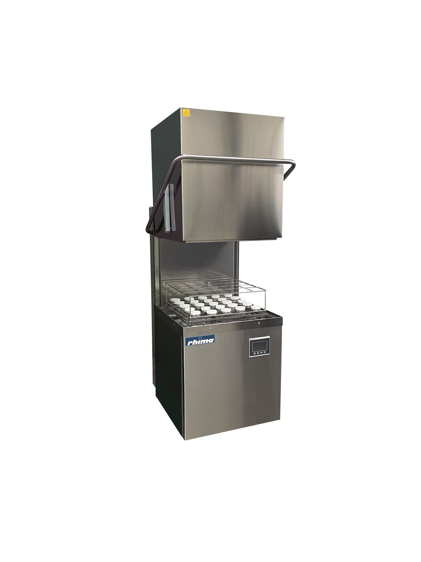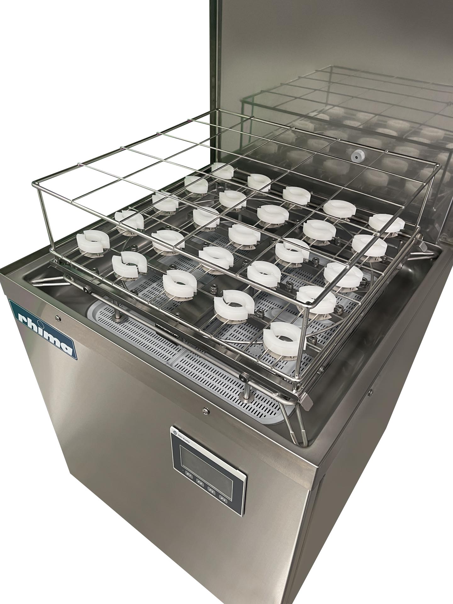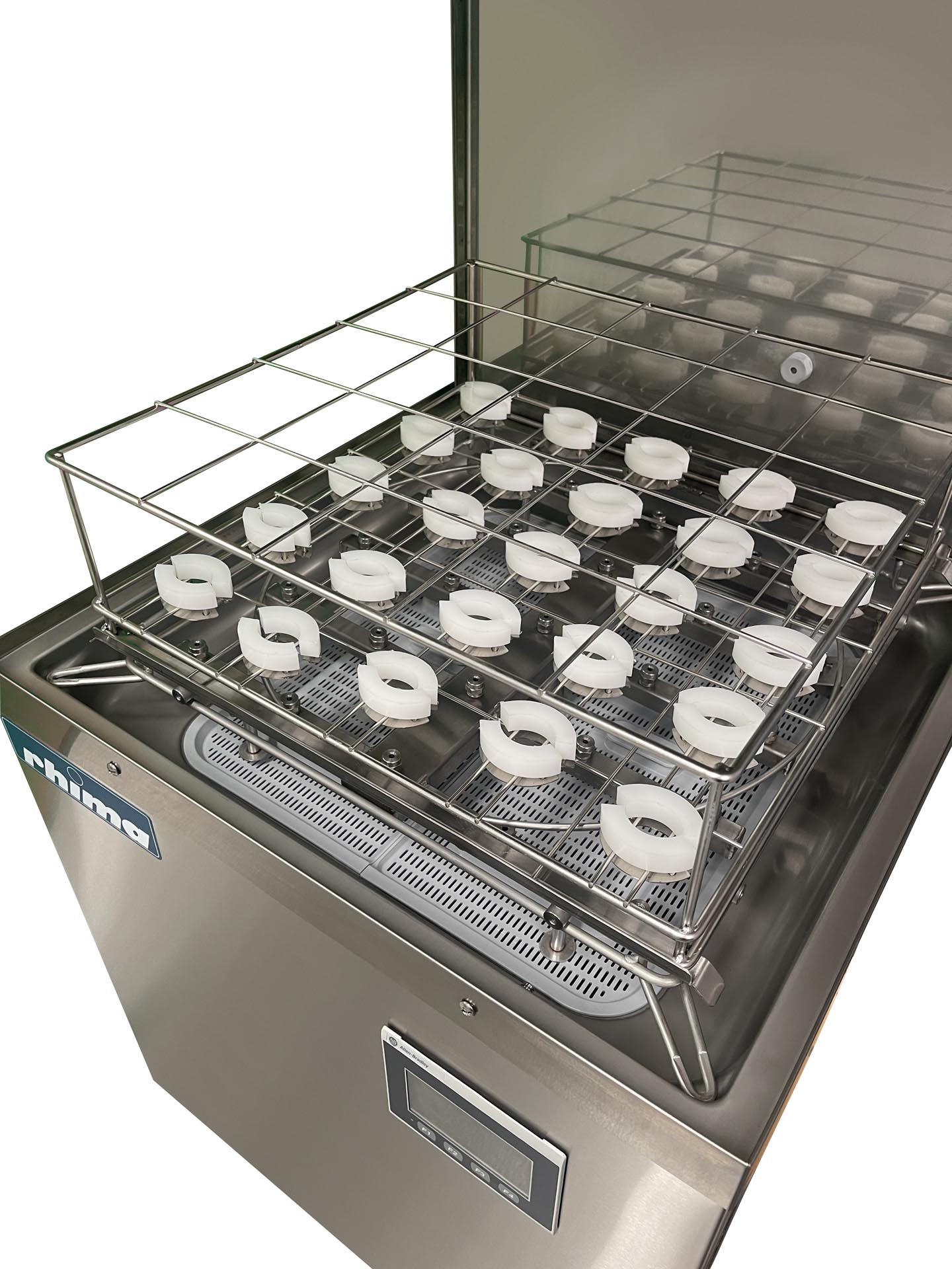 The pass through bottle washer uses a rack to hold the bottles and has a dedicated nozzle rack to ensure that water goes directly into the bottle. This guarantees that each bottle is cleaned and sanitised. There is a rotating wash arm that goes around the top to clean the outside of the bottles.