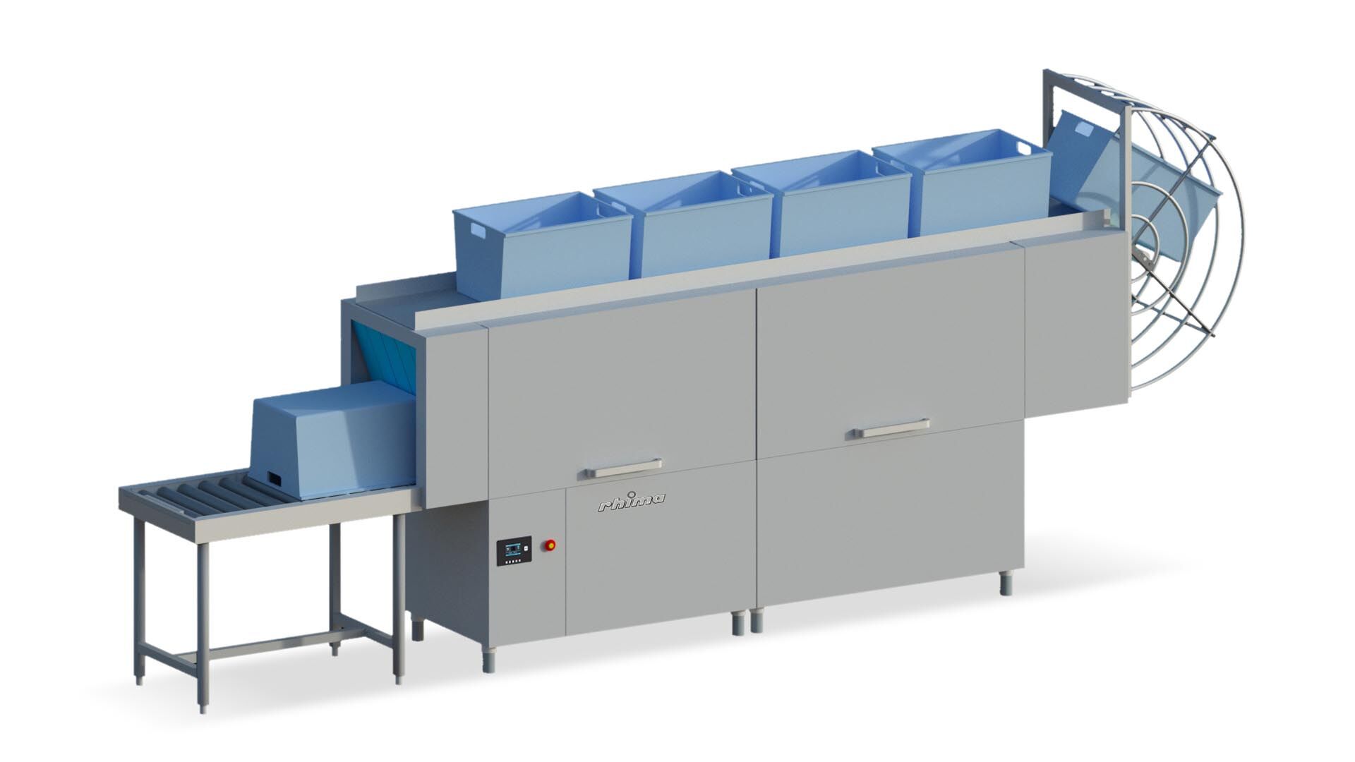 This unit has a hot (65°C) chemical wash and then a fresh water final rinse at min.82°C to comply with HACCP guidelines. Water consumption is minimal and water is recycled several times within the machine.
