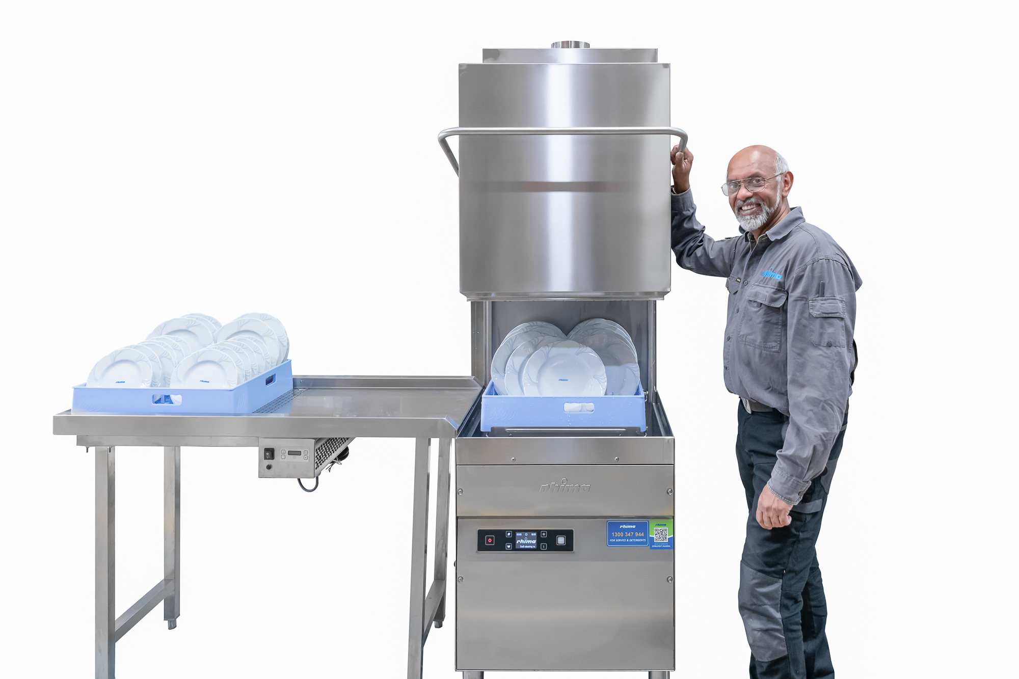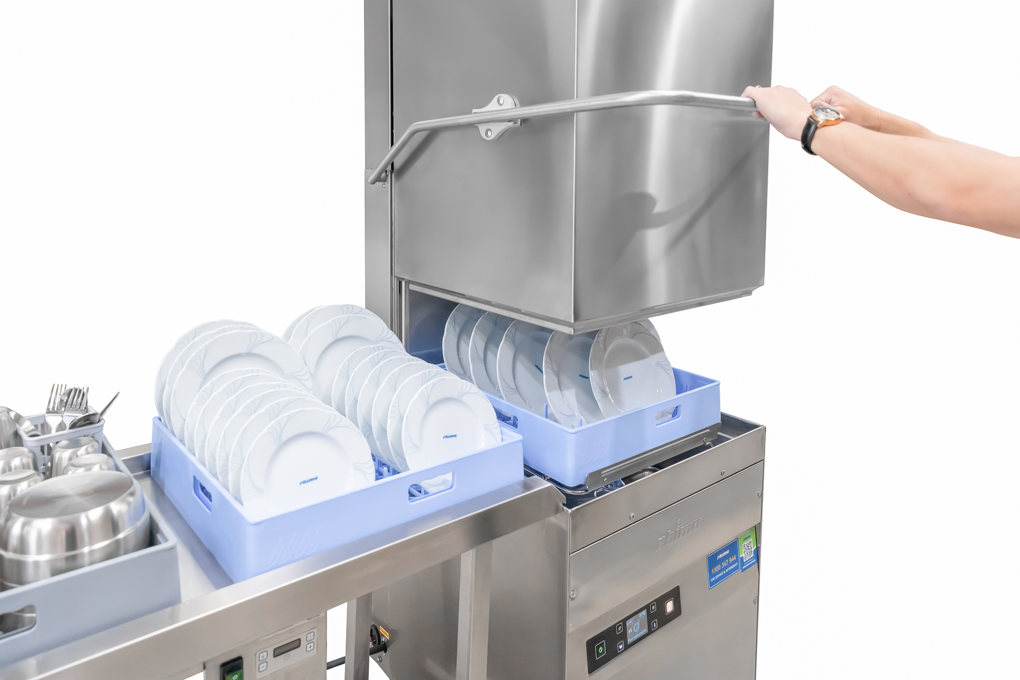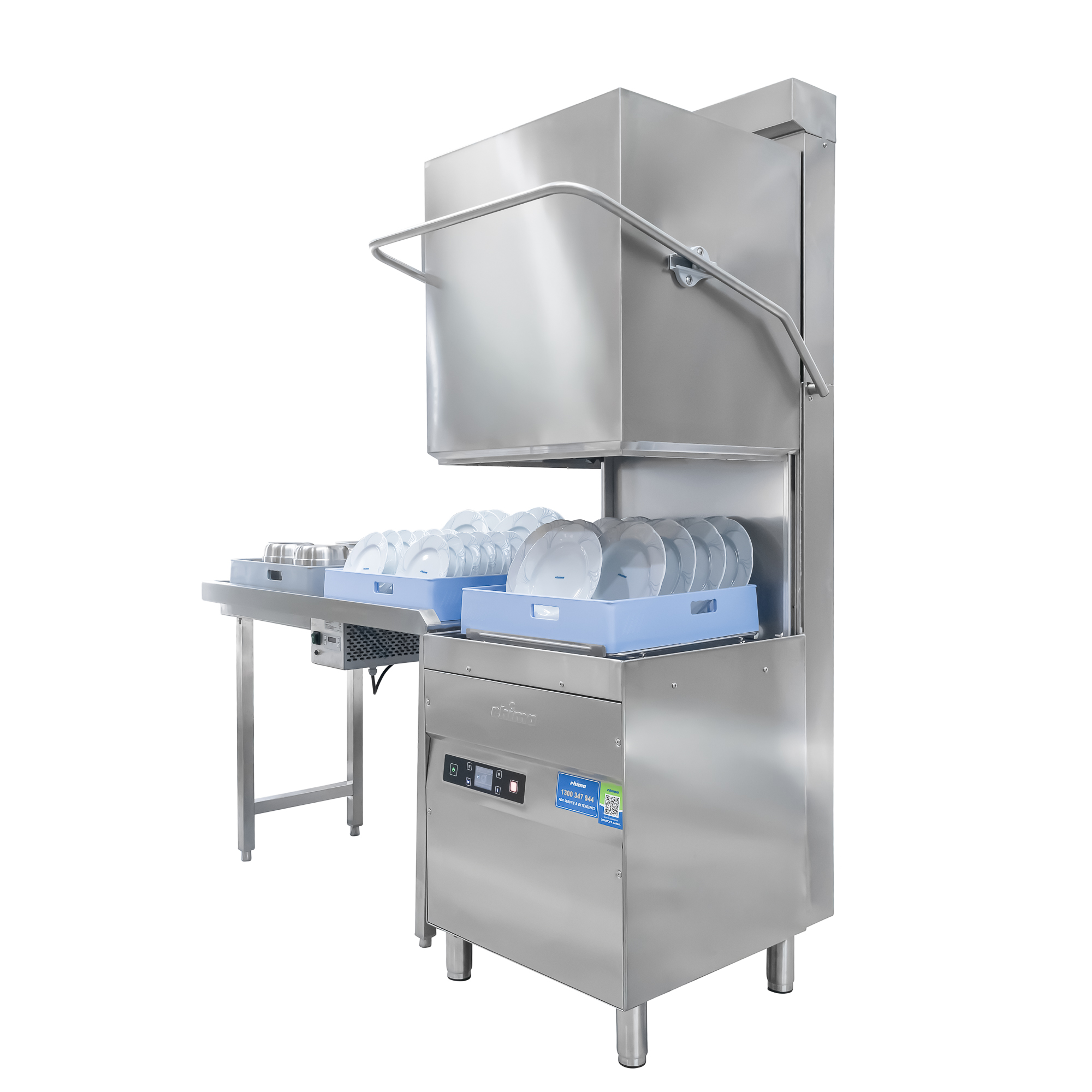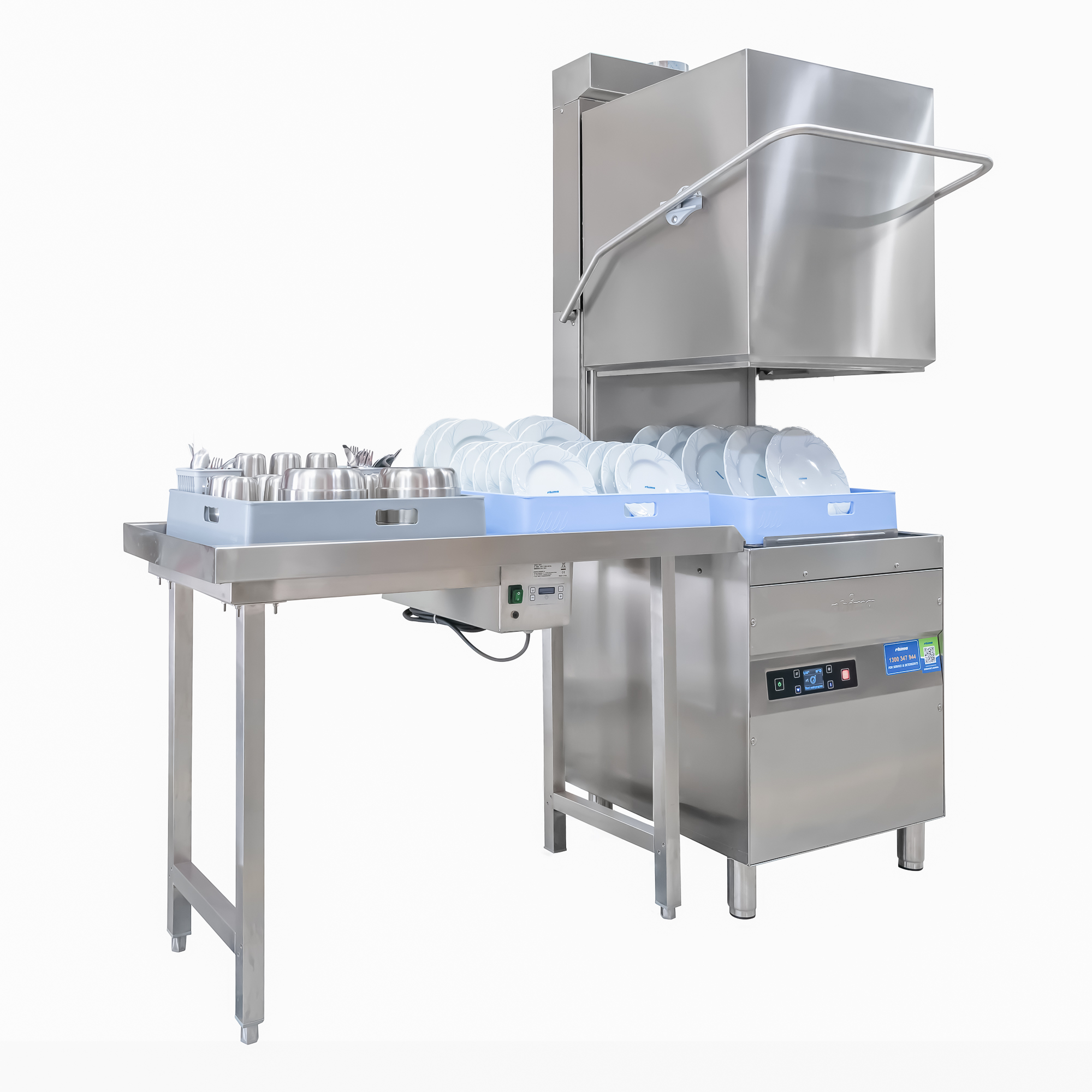 The RH-60 HR pass through dishwasher with Heat Recovery Unit comes with or without condenser and automatic hood. The Heat Recovery unit is an addition to our machines and eliminates the need for a separate extraction fan. It also gives savings of about 35% on energy costs. When you open the door of a dishwashing machine once a cycle has finished the steam comes out the open door, however with the Heat Recovery unit installed on top of the machine; this takes the steam up and condenses it out the top instead. It is always best to check with your local council on what is required in your area.